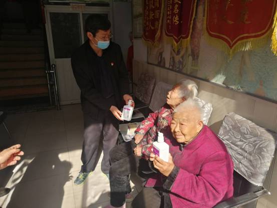 王玉杰书记带领大家分发酒精洗手凝胶,把每份温暖亲手送到老人手中并现场教老人如何使用。