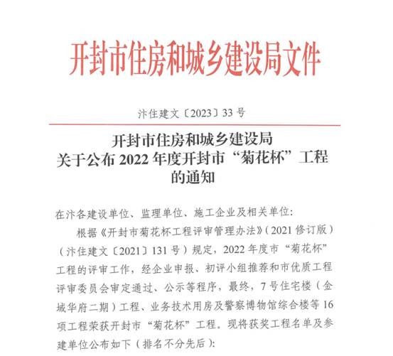 日前,2022年度开封市“菊花杯”(市优质工程)奖项评选揭晓,我校学生公寓12号楼工程建设项目在众多房屋建筑、装饰装修和市政道路工程建设项目中脱颖而出,被评选为开封市“菊花杯”工程,全市仅有16个建设项目斩获此殊荣。