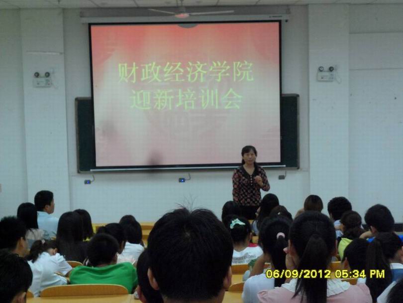 为更好地贯彻学校的做好2012级迎新工作的有关要求,财政经济学院于9月6日下午5:00在新校区17#-116教室召开了学院做好2012级迎新工作培训会,参与新生接待的2011级约150名同学参加了培训会,学院党总支书记李国莉老师对参加培训的同学们提出了8项具体的接待要求和在接待过程中的3项注意事项。