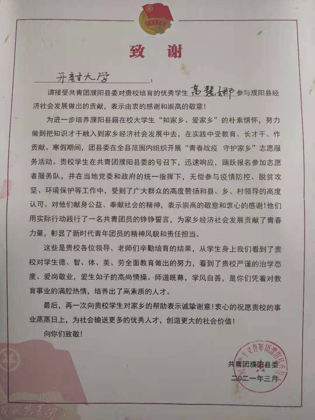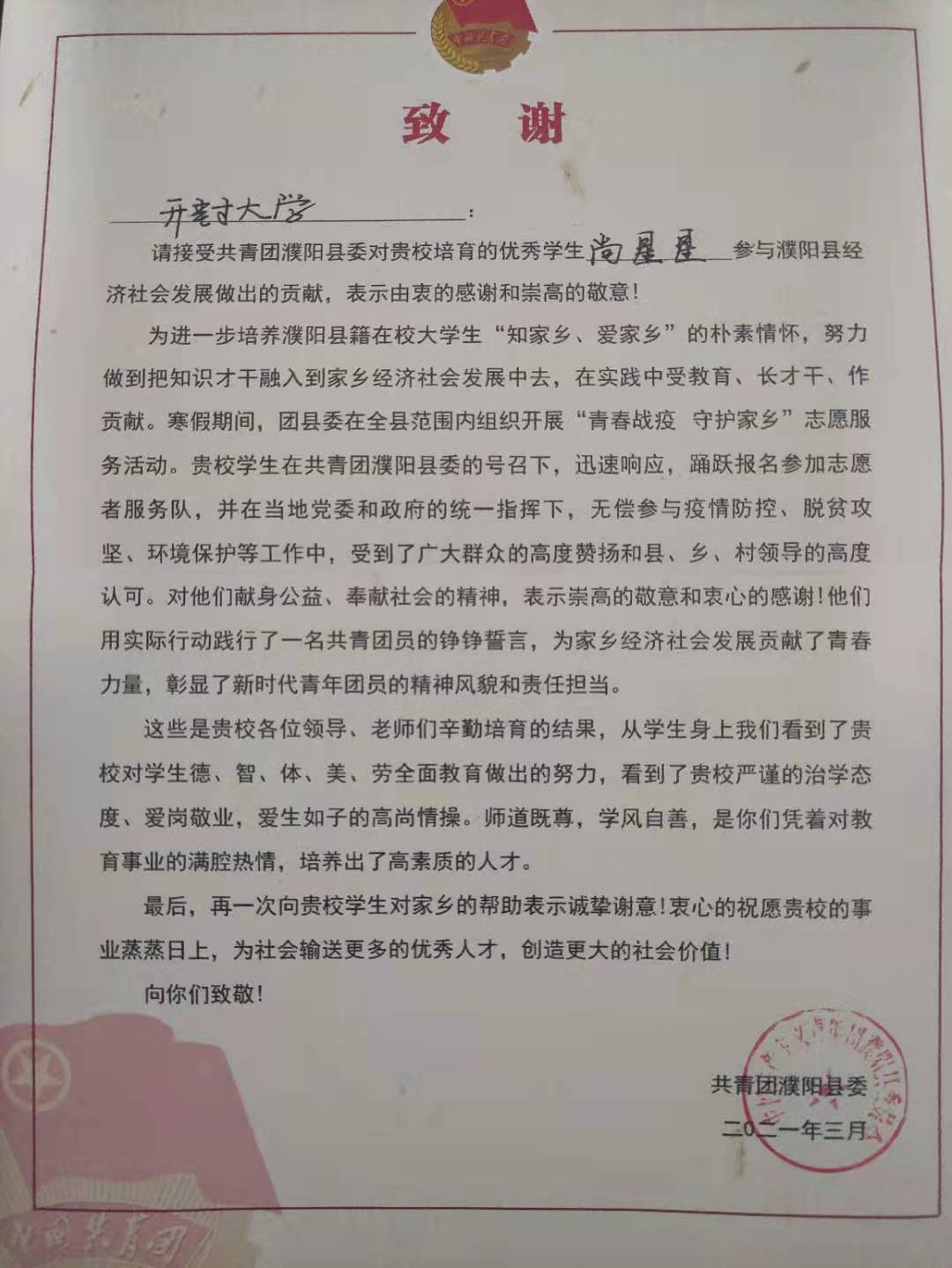 信中提到,尚星星、高慧娜两位同学在共青团濮阳县委的号召下,迅速响应,踊跃参与到卡口执勤、社区排摸、防疫宣传等方面的志愿服务工作中,他们的举动充分展现了有理想、有本领、有担当的时代青年品格,受到了各级领导和广大群众的高度赞扬。
