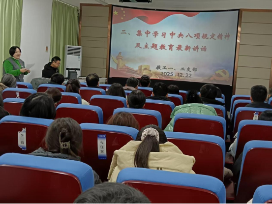 接着,学院党总支副书记马驰同志领学中央八项规定精神及习近平总书记主题教育最新讲话;党总支书记吴娟同志领学《中国共产党纪律处分条例》。