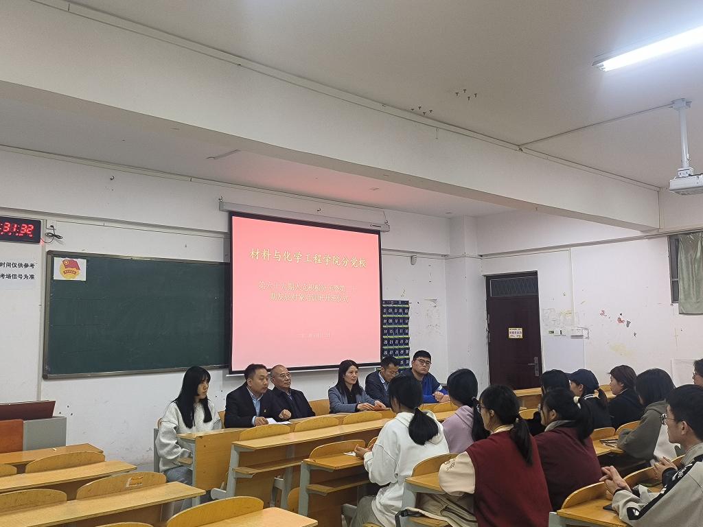 为加强青年学生的思想政治教育,培育新时代青年党员,引导他们树立正确的世界观、人生观和价值观,4月2日晚上7:30,材料与化学工程学院在7号楼206教室举行第69期入党积极分子暨第20期发展对象培训班开班仪式。学院党总支书记侯彦喜、副院长王丽、学生支部成员参加,仪式由团总支书记杨磊主持。