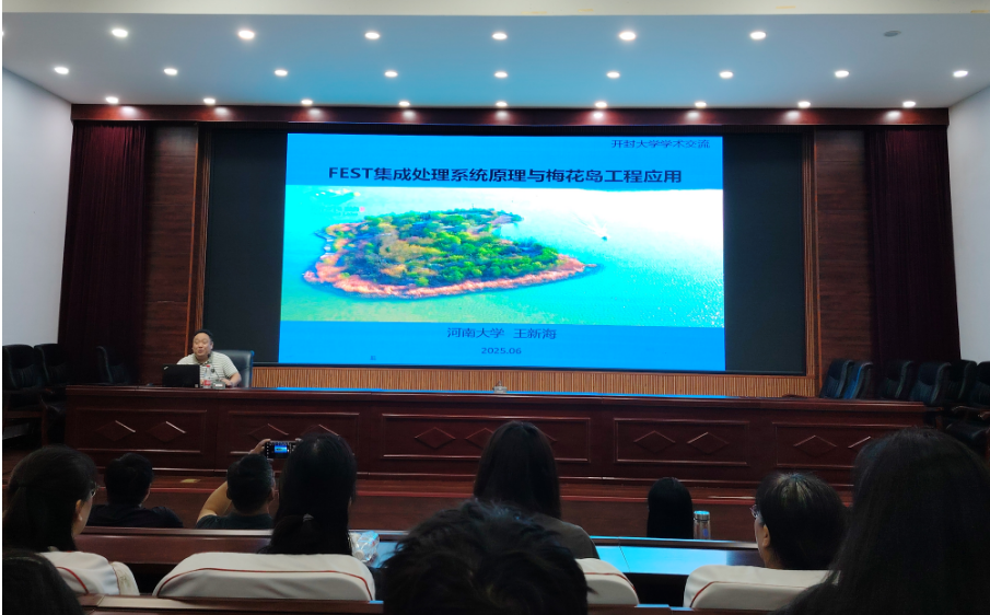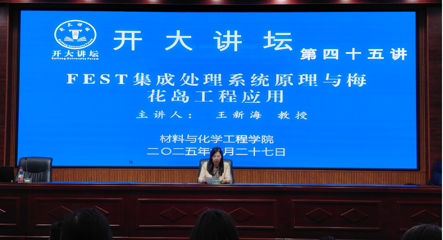 6月27日上午,“开大讲坛”第四十五讲在行政楼一楼报告厅顺利举办。本次讲座由材料与化学工程学院主办,特邀河南大学化学与分子科学学院教授、博士生导师、河南省工业冷却水循环利用工程技术研究中心副主任、河南省水生态智能装备工程技术研究中心副主任、河南省水资源循环与治理产业技术创新战略联盟总工程师王新海作了题为“FEST集成处理系统原理与梅花岛工程应用”的讲座。材料与化学工程学院200余名师生代表参加讲座。讲座由材料与化学工程学院院长韩艳霞主持。