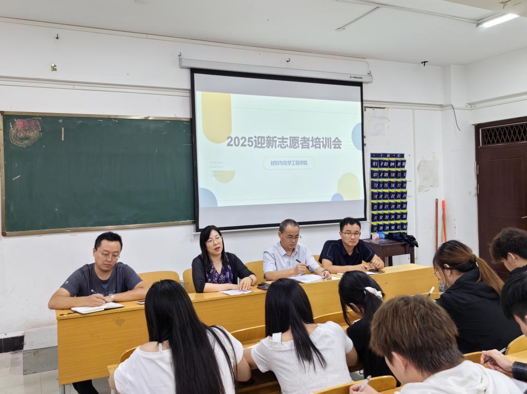 9月4日下午,材料与化学工程学院在3号楼204教室举行2025年迎新志愿者培训会。学院党总支书记郝喜才、院长韩艳霞、党总支副书记武志远出席会议,全体迎新志愿者参会。