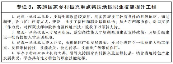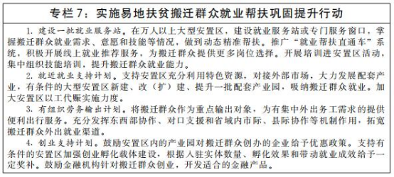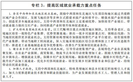 (六)提高区域就业承载力。 推动区域就业协调发展。支持东部地区发挥创新要素集聚优势,率先实现产业升级,开拓高质量就业新领域,培育高质量就业增长极。加快完善中西部和东北地区基础设施,提升产业集聚区公共服务效能,引导产业向中西部和东北地区有序梯度转移,推动就业机会向中西部和东北地区扩散。支持中西部和东北地区根据国家战略导向和发展重点,对接先进生产要素和创新资源,发展特色优势产业,改造提升传统产业,积极布局新兴产业,厚植就业创业沃土。 实施特殊类型地区就业促进行动。健全巩固拓展脱贫攻坚成果长效机制,统筹各类政策资源,强化后续扶持,以脱贫地区为重点,支持欠发达地区因地制宜发展吸纳就业效果好的富民产业。支持革命老区、边境地区等发展本地特色产业,推进资源型地区加快培育发展接续替代产业,完善就地就近就业配套设施,做好边民、少数民族劳动者和失地农民、下岗矿工、停产企业员工等困难群体就业帮扶。对高失业率地区开展专项就业援助,针对性开发和推荐就业岗位,促进失业人员再就业。 壮大县乡村促就业内生动力。深入推进新型城镇化和乡村振兴战略有效衔接,推动县乡村联动发展,促进产镇融合、产村一体,打造“一县一业”、“一乡一特”、“一村一品”经济圈,做好产业和就业帮扶。推进以县城为重要载体的城镇化建设,补短板强弱项,增强综合服务能力,促进绿色低碳发展,吸引各类生产要素向县城流动聚集,做大做强县域经济,扩大县城就业需求。支持乡镇提升服务功能,增加生产生活要素供给,为发展产业、带动就业创造良好条件,把乡镇建设成拉动农村劳动力就业的区域中心。完善农村一二三产业融合发展体系,丰富乡村经济业态,促进乡村产业多模式融合、多类型示范,打造乡村产业链供应链,加快乡村产业振兴步伐,培育乡村就业增长极。