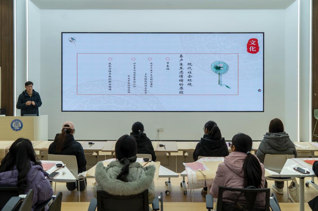 活动中,胡超老师分析了当前大学生面临的主要压力来源,引出宋代文人“以艺养心”的生活美学。他指出,宋代不仅是中国文化的高峰,也在书法、绘画、器物中融入了“格物致知”“静观内省”的哲学思想,同时强调创作过程中的自我表达与身心投入,鼓励学生将内心感受转化为艺术语言,在专注创作中缓解压力、沉淀心境。活动现场气氛融洽。