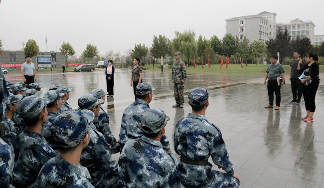 9月11日下午,校党委书记陈灿、校工会主席成芳带领学生工作部领导及相关工作人员冒雨来到图书馆大观广场慰问正在参加军事训练的19级新生和全体教官。