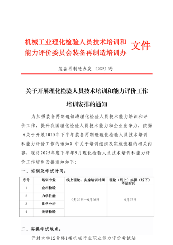 关于开展理化检验人员技术培训和能力评价工作培训安排的通知