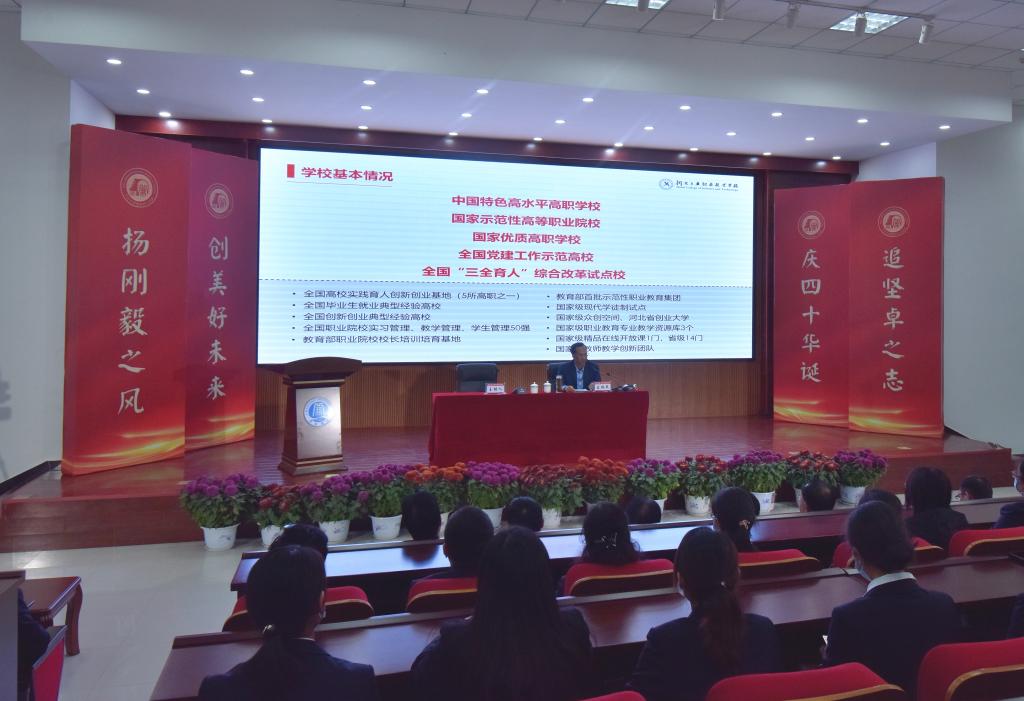 11月7日上午10:30,由我校主办的庆祝建校40周年暨“双高”建设论坛在行政楼一楼报告厅举行。河北工业职业技术学院党委书记王振杰教授应邀来我校作题为“产教融合,打造“四个高地”,特色发展,服务“钢铁重器”的专题讲座。讲座由我校校长宋志敏教授主持,河南省省级“双高”建设学校部分领导及bat365在线官方网站干部、教师聆听了论坛讲座。