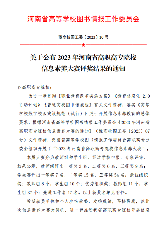 近日,河南省高等学校图书情报工作委员会公布了2023年河南省高职高专院校信息素养大赛评奖结果,我校荣获“最佳组织奖”称号,王艳敏、宋馨、张胜敏三名教师获得“优秀指导教师”称号,王艳敏获得“先进工作者”称号。信息工程学院叶子繁荣获学生组三等奖并晋级国赛。