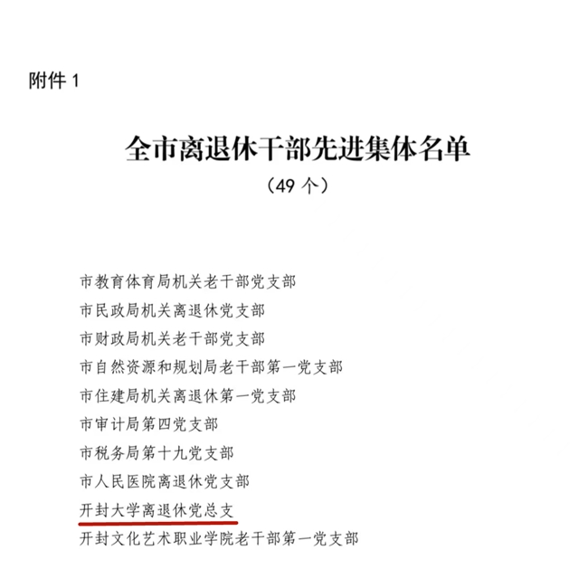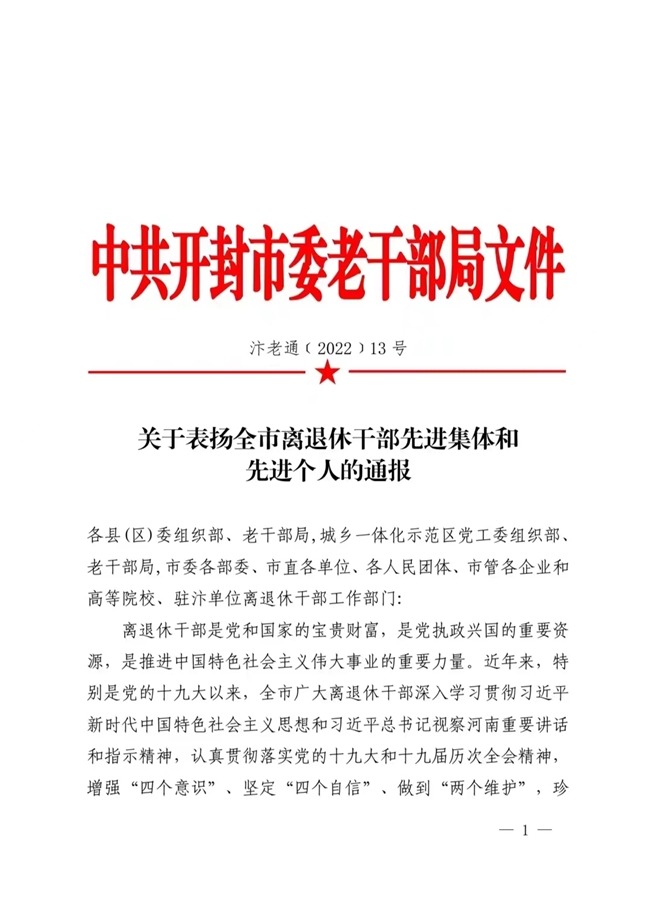 近日,中共开封市委老干部局印发了《关于表扬全市离退休干部先进集体和先进个人的通报》(汴老通〔2022〕13号),我校离退休党总支获评全市离退休干部先进集体,退休干部成鹏飞同志获评全市离退休干部先进个人。