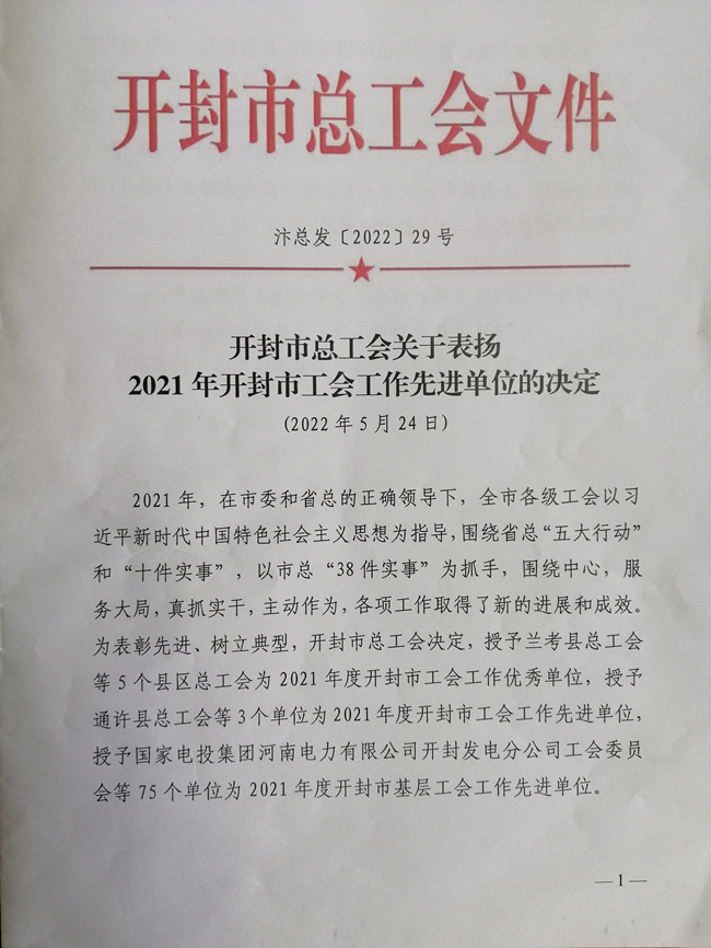 近日,开封市总工会召开表彰大会,我校工会荣获“2021年开封市基层工会工作先进单位”荣誉称号。