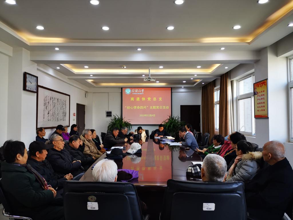 2019年12月4日上午,为推进“不忘初心、牢记使命”主题教育的深入开展,根据学校党委安排部署,离退休党总支在行政楼二楼会议室举行“初心使命四问”主题党日活动,离退休老党员积极踊跃参加活动。