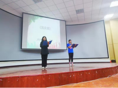 为庆祝中华人民共和国成立七十周年, 提升当代大学生对国家的认同感及民族凝聚力 国际教育学院在五号楼一楼报告厅 举行 庆国庆,颂祖国”诗歌朗诵会。 党总支副书记赵骅,团总支书记、2019级辅导员刘青及全体2019级学生参加了本次活动。