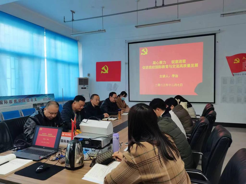 12月7日下午,我校党委委员、副校长李治深入国际教育学院,以“凝心聚力、锐意进取,促进我校国际教育与交流高质量发展”为题讲授了专题党课,国际教育学院全体教工党员聆听了党课。
