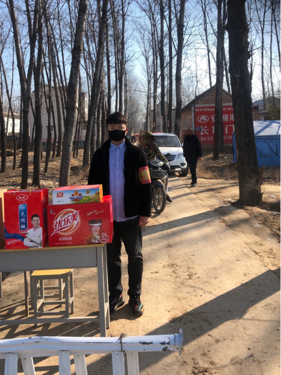 国际教育学院的2017级电子商务班学生孙晨涛,自费买了牛奶与火腿肠等慰问品去周口市太康县马头镇小孙店防役防控点慰问工作人员并在现场做志愿工作,作为一名预备党员他尽自己的所能为奋斗在一线的基层工作人员贡献自己的绵薄之力!