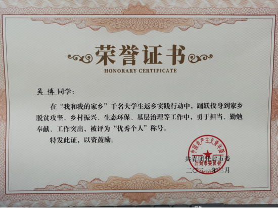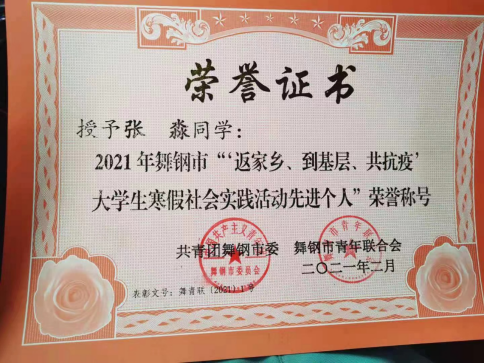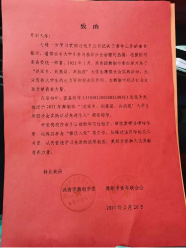 国际教育学院学生积极参与千名大学生返乡实践行动,18会计班吴博同学荣获共青团开封市委“我和我的家乡”千名大学生返乡实践行动“优秀个人”称号;18会计班张淼同学获共青团舞钢市委“返家乡、到基层、共抗疫”大学生寒假社会实践活动先进个人称号,为学院争得了荣誉。