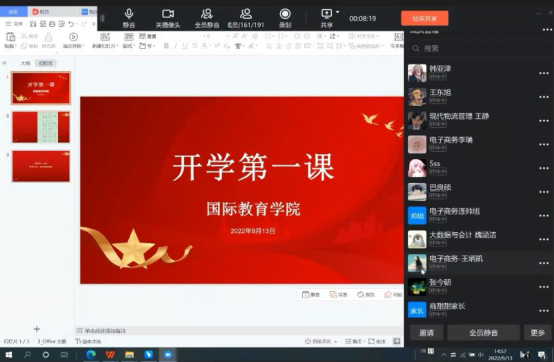 9月13日午,为做好疫情形势下新生的入学教育工作,加强大学生学业教育、安全教育和疫情防控常态化下的日常教育管理,推动新学期学生工作的有序开展,我院2022级新生辅导员开展线上“开学第一课”主题班会。