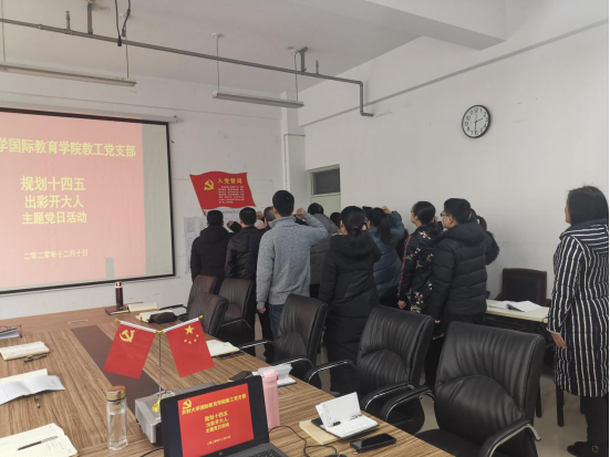 12月10日下午,国际教育学院教工党支部召开“规划‘十四五’,出彩开大人”主题党日活动。范晓筠同志领誓,所有党员在党旗下宣誓,并学习了习近平总书记在《全国劳动模范和先进工作者表彰大会上的讲话》以及市委侯书记十九届五中全会精神宣讲暨《读懂开封城,争做出彩开封人》思政课精神。胡蓓晖和许亚威两名党员同志过政治生日,陈力同志送出寄语。所有党员按照最新党费标准交纳了党费。