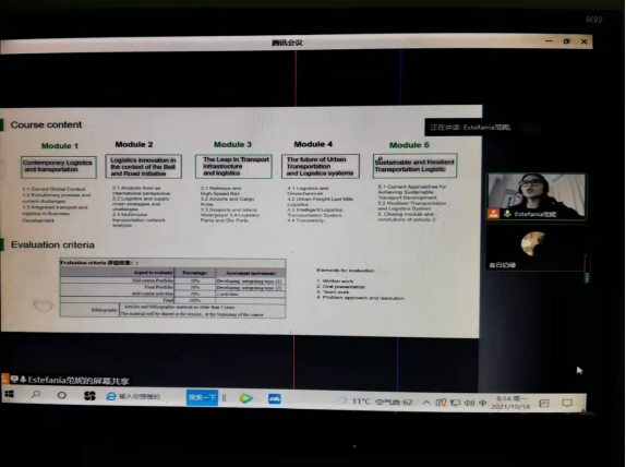 本门课程由格林威治大学Estefania Lopez教授在腾讯课堂进行为期两星期的线上直播授课,她将从Contemporary Logistics and Transportation 、Logistics and Supply Chain Innovation in the Context of the Belt and Road Initiative、The Leap in Transport Infrastructure and Logistics、The Future of Urban Transportation and Logistics Systems、Sustainable and Resilient Logistics等五个部分进行讲授,并对同学们进行过程性评价与考核。