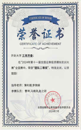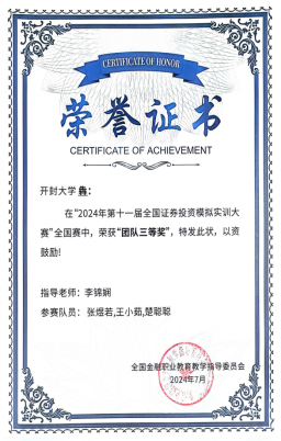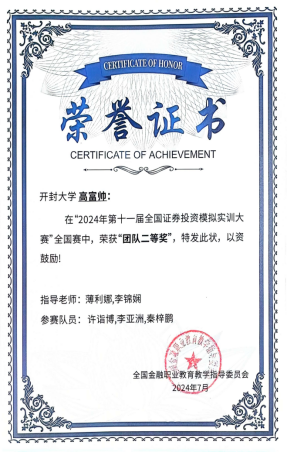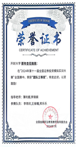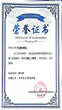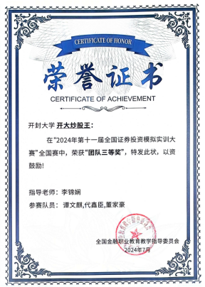 由全国金融职业教育教学指导委员会主办的“2024年全国证券投资模拟实训大赛”于2024年7月圆满落幕。我院共有20支代表队参加比赛,与近200所高职院校、2000多支队伍进行激烈角逐,最终,1支队伍获得团体一等奖,3支队伍获得团体二等奖,4支队伍获得团体三等奖。