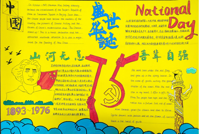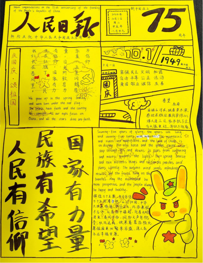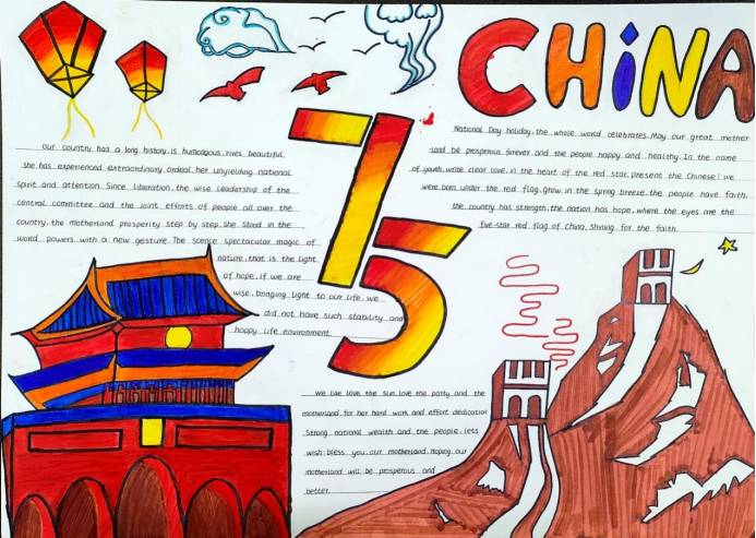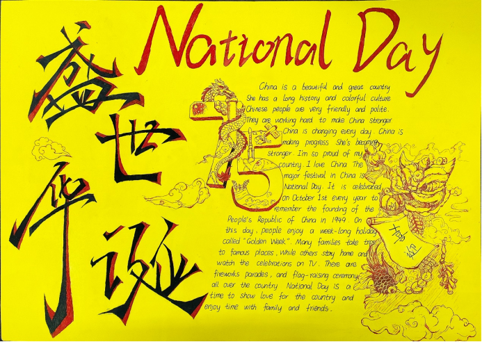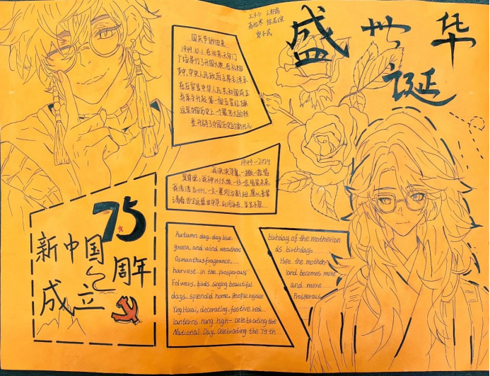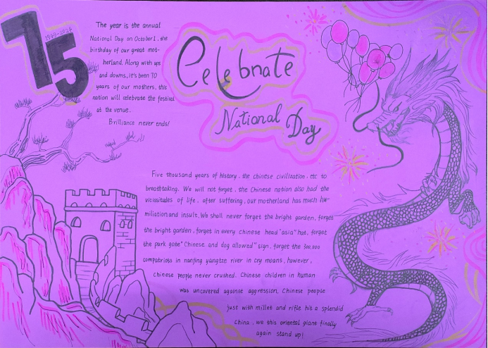 本届英语手抄报大赛以“庆祝新中国成立75周年华诞”为主题,由学院2024级全体学生参与,以小组为单位,通过手抄报,展示中华儿女的拳拳爱国之情,将学子的真挚祝福献于新中国成立75周年华诞。比赛分为初赛和复赛两个阶段,综合班级投票,学院全体老师投票以及评审团评审,最终评选出一等奖2组,二等奖4组,三等奖6组和最佳人气奖3组。