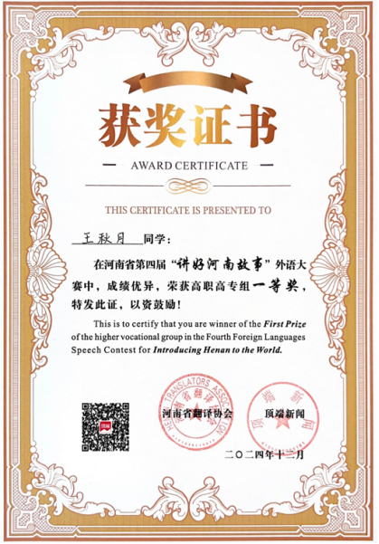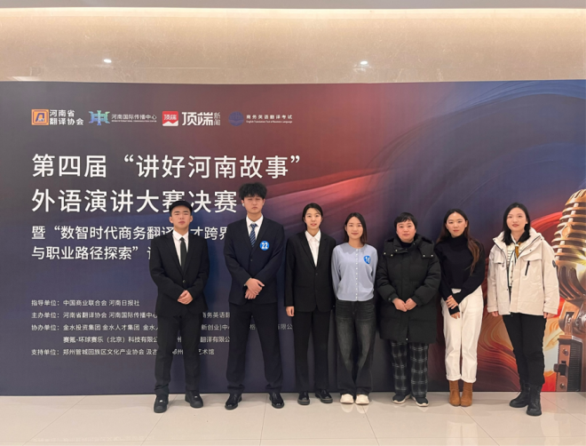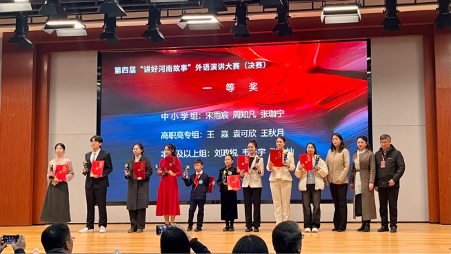 12月28日,第四届“讲好河南故事”外语演讲大赛决赛在郑州举行。我院学子在此次大赛中表现卓越,获得一等奖1项,三等奖3项。