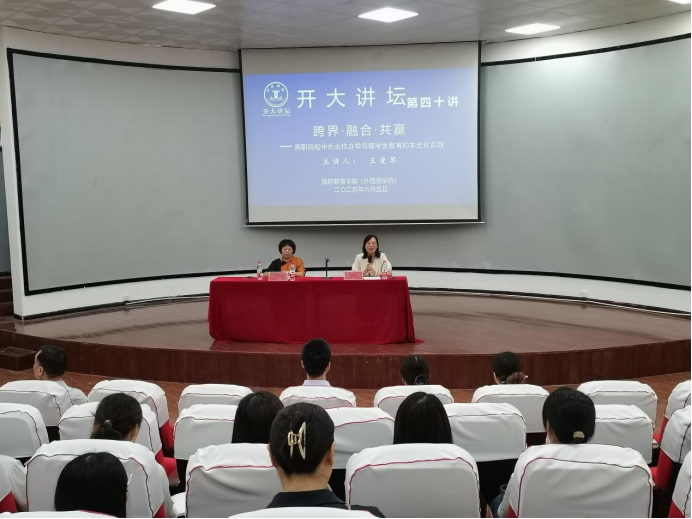 2025年6月5日下午,bat365在线官方网站国际教育学院(外国语学院)、国际交流合作处共同举办“开大讲坛”系列专题讲座,此次活动特邀黄河水利职业技术大学王爱琴教授,带来主题为《跨界·融合·共赢——高职院校中外合作办学与留学生教育的本土化实践》的深度分享。讲座由国际教育学院(外国语学院)党总支书记、国际交流合作处处长程欣主持,学院全体教师及学生代表参加。