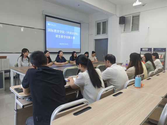 2025年7月3日下午,国际教育学院(外国语学院)在5号楼二楼会议室举办了课堂教学创新大赛。院长蒋大山、副院长黄艺琴、教研室主任和部分骨干教师担任评委。