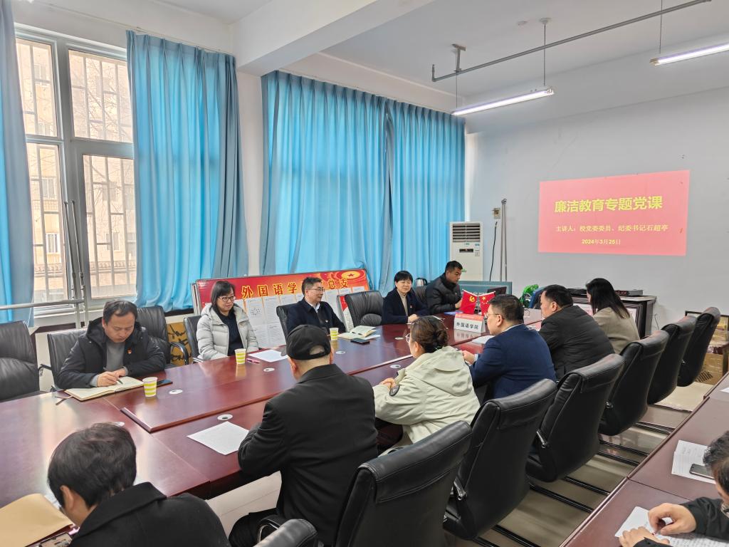 3月25日下午,校党委委员、纪委书记石超亭以《正确认识一体推进“三不”的深刻内涵 做忠诚干净担当的新时代好党员好干部》为主题给外国语学院全体教工党员上廉洁教育专题党课。