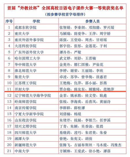 Site news Recently, the official public number of Shanghai Foreign Language Education Publishing House announced the list of winners of the first “Foreign Language Education Publishing House Cup” National Japanese Language E-CoursewareContest, and the team of Jia Huixiao, a teacher from the School of Foreign Languages ofKaifeng University, won the first prize.