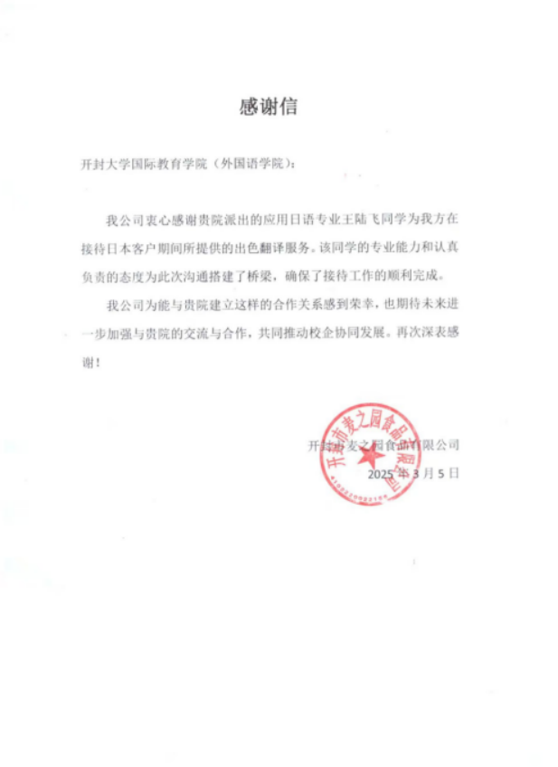 Recently, Wang Lufei, a student from the Class of 2022majoring inApplied Japanese at International Education College (College of Foreign Languages)ofKaifeng University, successfully served as an accompanying interpreter for a Japanese client visiting Kaifeng Maizhiyuan Food Co., Ltd.,Drawing onhis outstanding professional competence and international perspective, Wang delivered a fluent, accurate and culturally sensitive performance—vivid proof of the College’sexceptional achievements in cultivating application-oriented talents and serves as a vivid example of how applied talents can contribute to society andfosterinternational exchanges.