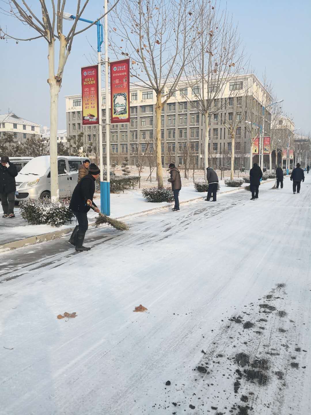 1月10日迎来了2019年的第一场雪。一夜的大雪给老师们校园出行带来困难。清早,后勤管理服务中心主任徐纪珂带领员工们在校南大门及校内环路进行扫雪除冰活动。大家纷纷挥动扫把、铁锨,积极加入到扫雪的队伍当中去,奋力清理道路积雪和冻冰。经过大家的共同努力,很快将校内主干道的积雪清理干净,为全校师生出行安全提供了方便。