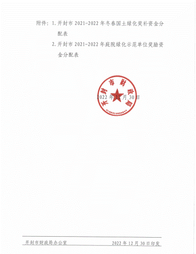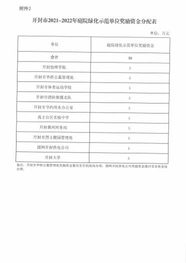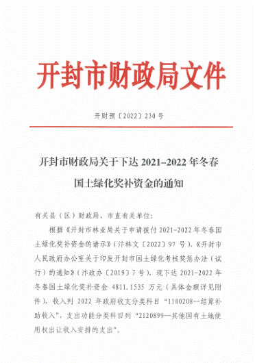 近日,开封市财政局发布了《开封市财政局关于下达2021-2022年冬季国土绿化奖补资金的通知(开财预【2022】230号)》,bat365在线官方网站获开封市2021-2022年庭院绿化示范单位奖励资金5万元。
