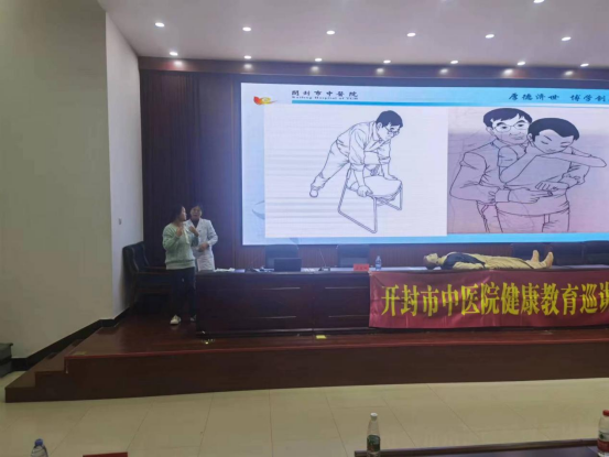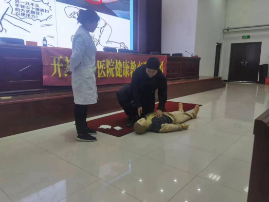 韩圣宾副主任医师重点讲解了秋季肠道传染病、呼吸道传染病、虫媒传染病等常见传染病的发病原因、传播途径、临床症状等防控知识。王亚丽主治医师讲解了常见的四种急救方式,并与同学们互动,现场演示了海姆立克急救法和心肺复苏法的步骤方法。
