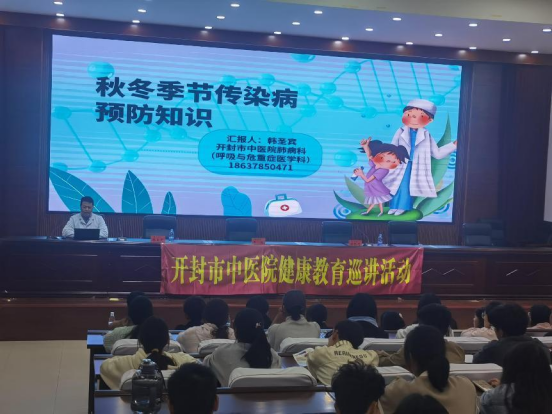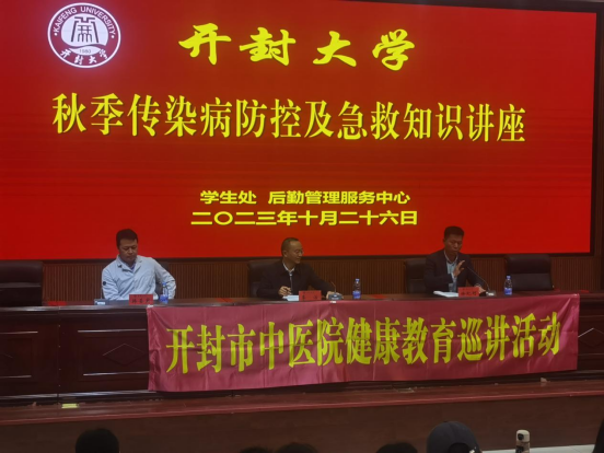 为做好秋季传染病防控工作,普及校园常见传染病预防和急救知识,提高师生自我防护能力,10月26日下午,我校邀请开封市中医院韩圣宾和王亚丽两位医务专家在行政楼一楼会议厅开展“后勤课堂—秋季传染病防控及急救知识”讲座。副校长李治出席了活动,活动由后勤管理服务中心主任徐纪珂主持。全校各院部200余名师生参加了活动。