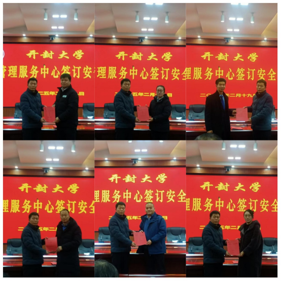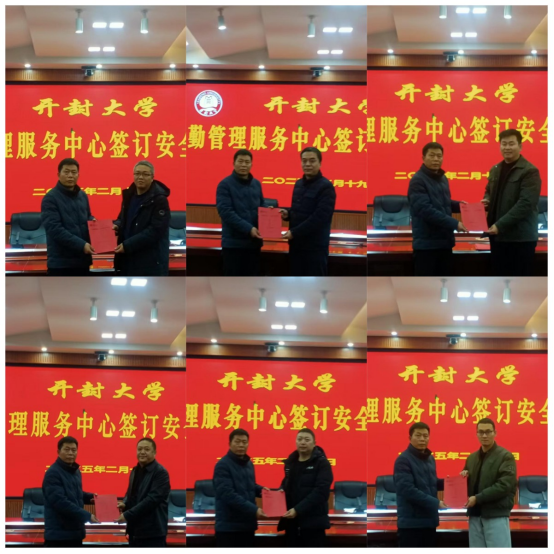 会上,首先由袁震宣读了后勤管理服务中心关于成立消防安全工作小组的通知,成诤磊、梁战军、丁召彬三位同志分别对校园环境、学生宿舍、学生餐厅的年度安全工作计划进行了汇报。然后,按照安全责任体系的划分,中心负责人与各部门分管领导、各科室与各委托服务单位分别签订了安全稳定责任书,通过层层签订安全责任书,做到层层有压力、人人有责任,形成安全责任全覆盖机制。