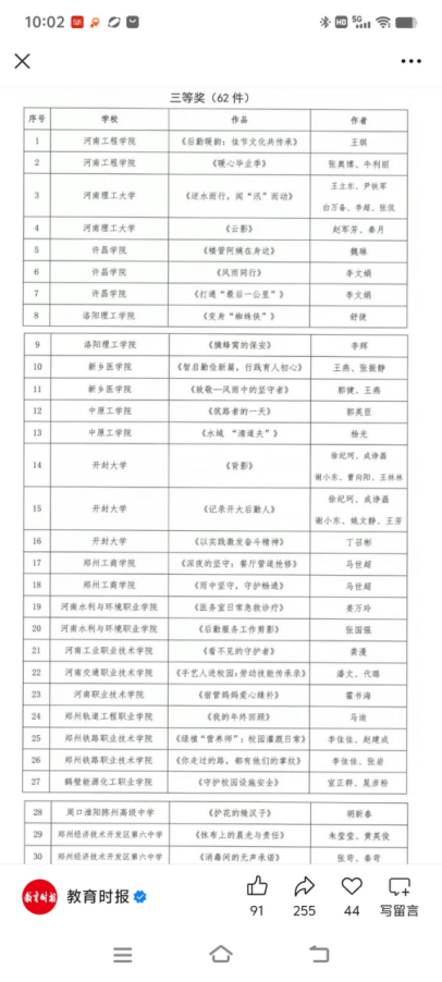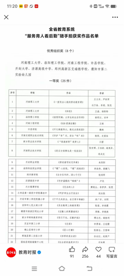 近日,河南省教育后勤协会公布了全省教育系统“服务育人看后勤”随手拍获奖结果。由于我校组织工作突出,成绩显著,学校获评“优秀组织奖”;我校参赛作品《学生餐厅服务育人》、《以爱筑家,以情暖心》获得二等奖,《背影》、《记录开大后勤人》、《以实践激发奋斗精神》获得三等奖。