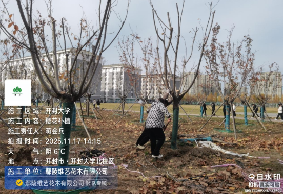 该樱花林原为学校苗圃地,于2024年3月15日改造升级而成,共栽植早樱、晚樱182棵,旨在打造“春有花、夏有荫、秋有景、冬有型”的景观打卡地。然而,受去年冬季极端低温和今年夏涝影响,共有12棵樱花出现根系腐烂、树干干枯等现象。后勤中心第一时间启动质保响应程序,督促乙方养护单位制定补栽方案,确保在樱花落叶期完成更换,提高成活率。