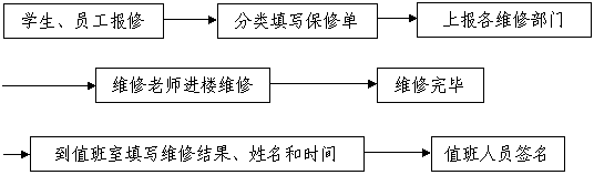5.维修工按学校规定作息时间上班并与学校其他维修工一起参与24小时值班,负责全校突发事件的维修处理。