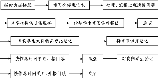 4.督促学生遵守宿舍规章制度及作息时间,按时开、关楼门,按时熄灯、送电。