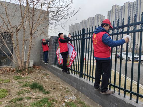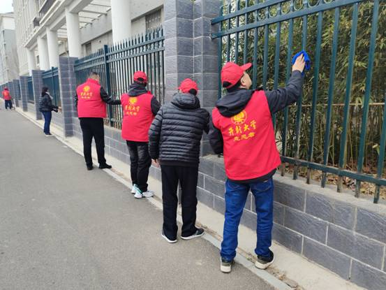 初春的天气,虽然还有些许寒意,但寒风挡不住党员们不怕苦、不怕脏的干劲儿,同志们认真擦拭沾满灰尘的学校围墙栏杆和宣传广告牌。经过了将近两个小时的劳动,学校南大门东西两侧围墙栏杆清洁靓丽、焕然一新,看着满是尘土的双手,大家露出开心的微笑。