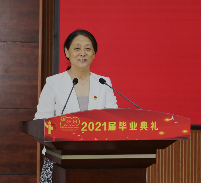 校党委书记陈灿为优秀毕业生代表颁发了毕业证书并讲话。她指出,2021年是中国共产党成立100周年,也是“十四五”规划的开局之年,bat365在线官方网站将和2021届毕业生们一道迈入新时代,踏上新征程,奋力推进“双高校”建设和申办“本科层次职业教育”工作。临别之际,陈书记向同学们叮嘱了四点要求:一是坚定信念,守望家国情怀。让个人抱负与国家发展同频共振,人生理想与民族命运休戚与共,谱写“共岁月峥嵘、留历史回响”的动人乐章。二是顺应时代,坚持勤奋创新。以积极向上的心态和发展的眼光积蓄改革创新的本领,在时代大潮中借力前行。三是实干好学,恪守知行合一。要在干中学、学中创、创中有,从实干中增长阅历,在坚持中绽放光芒。四是体面工作,做到快乐生活。让工作环境永远美好,让内心始终坦然豁达,做一个爱生活、会生活、有格局、高品位、乐观向上、正能量的人。