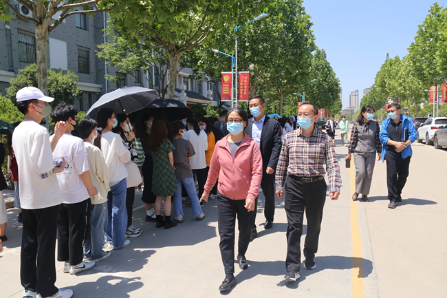 本站讯 为深入贯彻落实省市各级主管部门疫情防控要求,进一步做好疫情防控工作,坚决筑牢校园疫情防控安全防线,5月4日,学校在全校范围内开展核酸检测工作。学校党委书记陈灿、副校长李治一行深入我校核酸检测现场检查指导工作。党政办公室、党委宣传部、学生工作部相关负责同志参加检查。