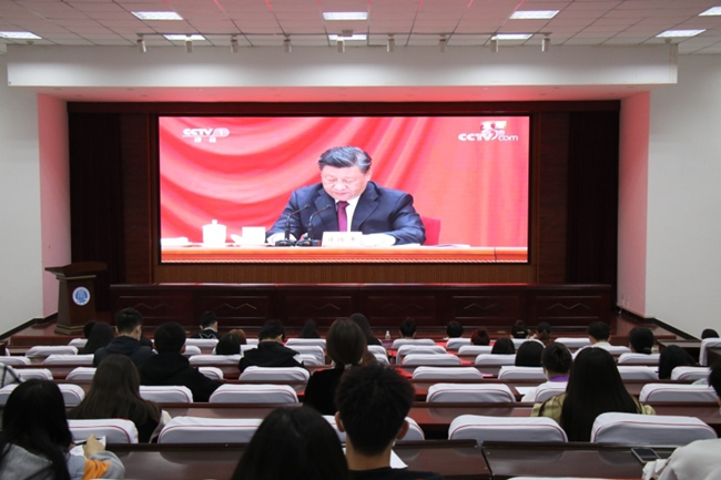 校党委副书记储建新、校团委全体人员、部分师生代表在我校行政楼第一会议厅观看庆祝大会。各院部团总支通过网络、手机等渠道,收听收看大会直播,深刻学习领会习近平总书记重要讲话精神。