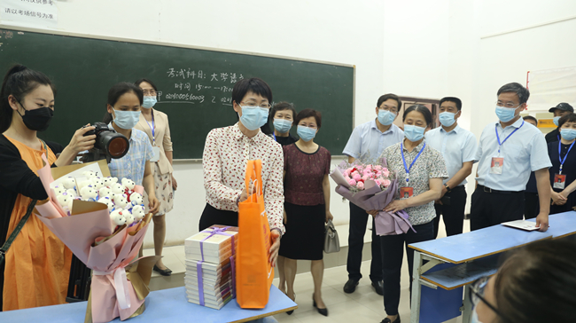 在各级领导及老师的关怀鼓励下,袁琳林同学顺利完成考试。考试结束后,开封市妇联、市教体局、市招办的领导亲切慰问了考生及家长,为考生送上励志的书籍和营养品,校党委书记陈灿代表学校为袁琳林同学送上表达祝福的花束,校长宋晓炜为袁琳林同学颁发毕业证书,学院领导也送上全体师生的美好祝愿,使考生和家长倍感温暖和感动。袁琳林同学激动地说:“我非常感谢各级领导和老师对我的关心、支持和帮助,我将不辜负大家的期望,争取早日康复,以优异的成绩为bat365在线官方网站争光。”