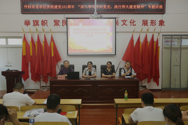 本站讯 6月29日,我校组织教师深入开封市龙亭区新时代文明实践中心开展庆祝中国共产党成立101周年“深入学习中共党史 践行伟大建党精神”专题报告。龙亭区宣传部副部长熊亚杰、文明办副主任王春玲,校党政办公室、党委宣传部、马克思主义学院负责人等参加此次宣讲活动。活动由熊亚杰主持。