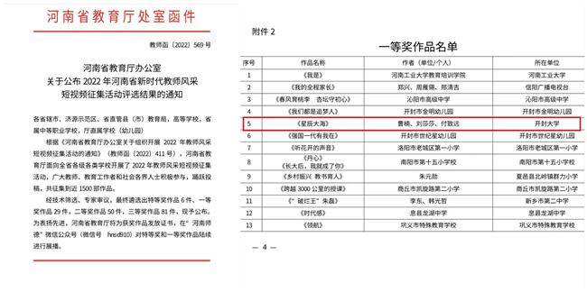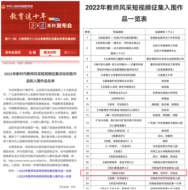 本站讯 近日,在“教育这十年”1+1系列发布会上,教育部公布了2022年新时代教师风采短视频评选结果,我校公共艺术教研部教师曹楠所创作的舞蹈短视频《星辰大海》荣获入围作品奖,该作品同时获得省教育厅评选一等奖。