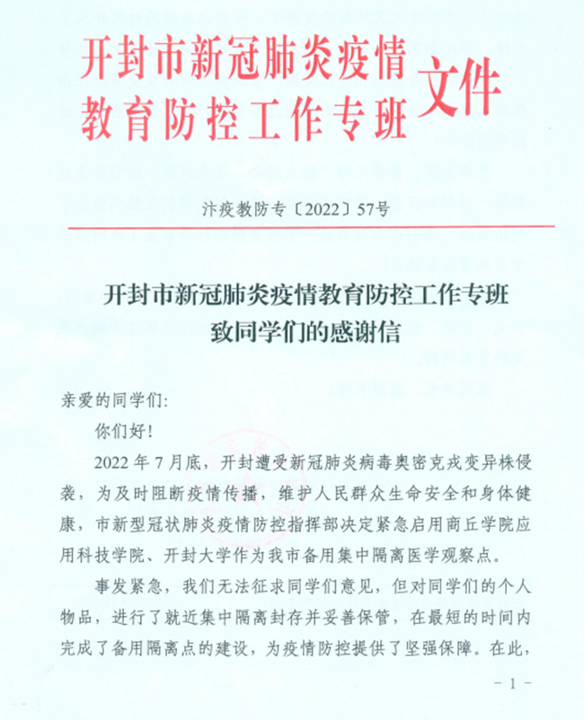 本站讯 7月底以来,开封市区受到了两轮新冠肺炎疫情的侵袭,做好疫情防控、保障人民安全成为第一要务。我校接受了将学生宿舍改造成集中隔离医学观察点的紧急任务,时间紧,任务重,学校全体师生闻令而动,迎难而上,勇于担当,仅用一天一夜的时间就完成了1800余间宿舍的基础改造,为全市打赢疫情防控战贡献了开大力量。鉴于我校全体师生的突出表现,开封市人民政府向我校发来表扬信,开封市新冠肺炎疫情教育防控工作专班向全体同学发来感谢信。