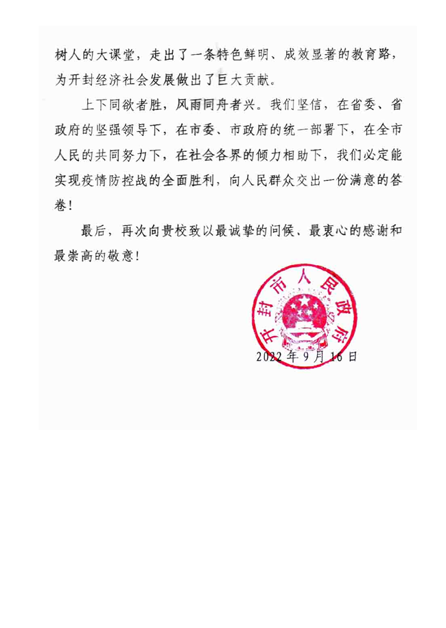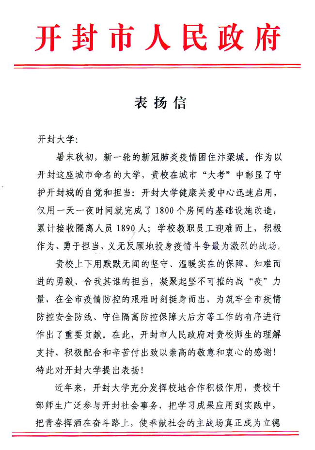 开封市人民政府在表扬信中指出,在新一轮新冠肺炎疫情侵袭开封之时,我校教职员工迎难而上、积极作为、勇于担当,仅用一天一夜的时间就完成了1800个集中隔离房间的基础设施改造,为筑牢全市疫情防控安全防线、守住隔离防控保障大后方作出了重要贡献。肯定了近年来我校干部师生广泛参与开封社会事务,在奉献社会的主战场展示立德树人教育成果,为开封经济发展社会发展作出的巨大贡献。